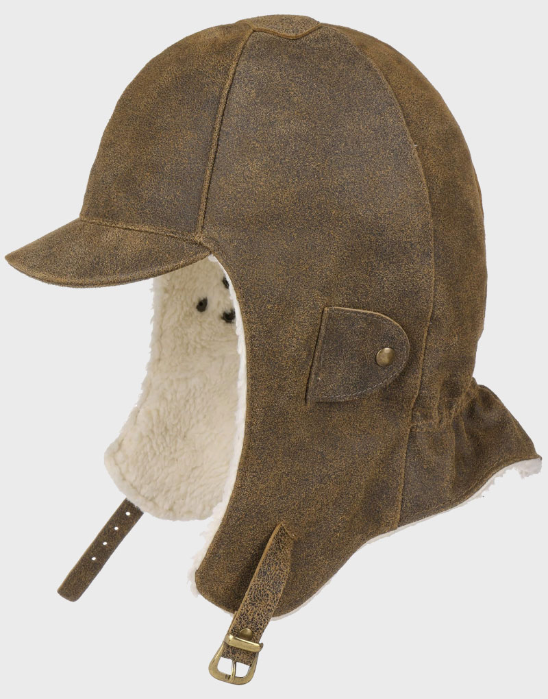 Soft, fluffy fleece on the inside right down to the ears, smooth leather on the outside in a distressed, mottled look: this is the rustic aviator cap that curls up comfortably on the head. If the weather turns threatening, the beanie with long side panels can be secured under the chin, with raindrops ricocheting off the front visor. Ideal for air travel and winter travel.