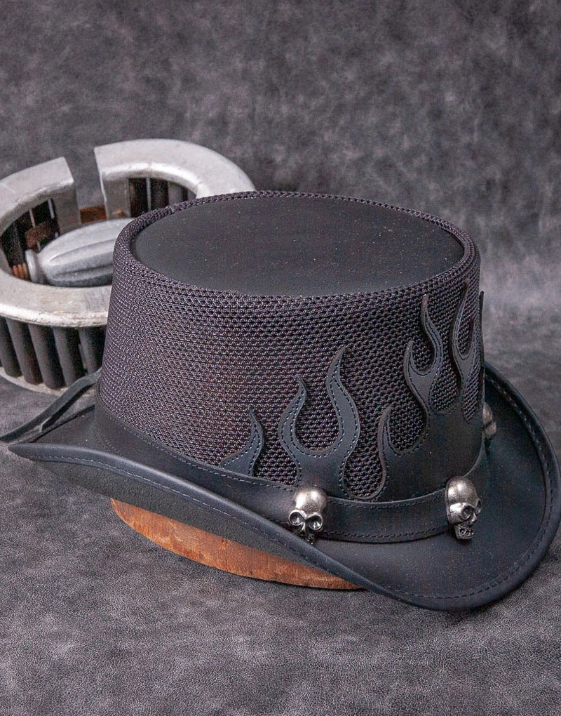 <p>Flames leather top hat by Voodoo Hatter has a crown constructed entirely of mesh, combining the comfort of our ultra breathable sun hats with the unmistakable attitude of our top hats. A leather flame applique dances around the crown of this badass vented top hat, and the intimidating 3 Skull band make sure that everyone knows you mean business. • High Quality Craftsmanship hand made • Real Leather • 100% pure leather</p>