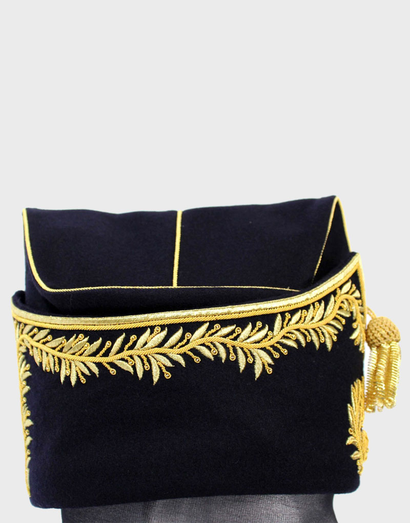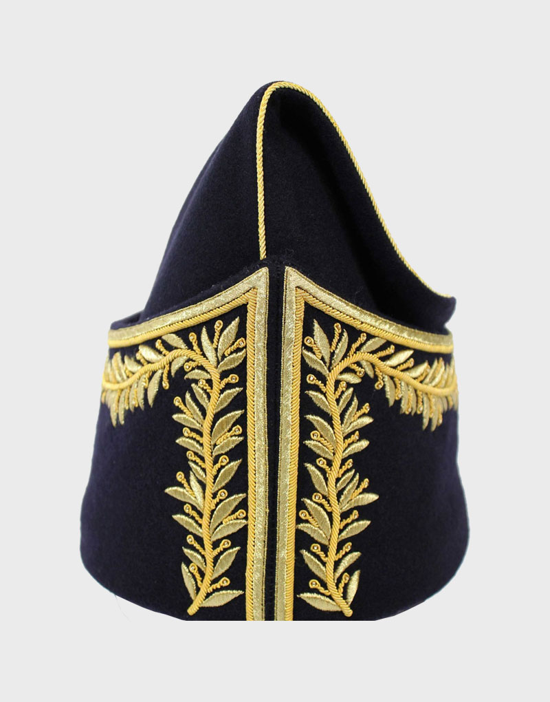 It is called, in French, a Bonnet de police. It is an off-duty forage cap for a general. It is Made in dark blue wool with gold embroidery. This example has embroidered Laurel leaves, which are Hand embroidered. Copied from musée de l’Empéri.