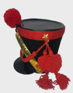 With adjustable waistband and embossed black leather front frame, set in silver-colored front rail, linen lining, metal cockade and red wool pompom and curtain.
