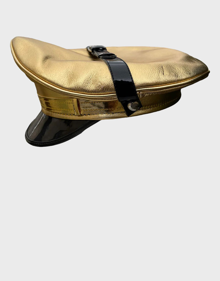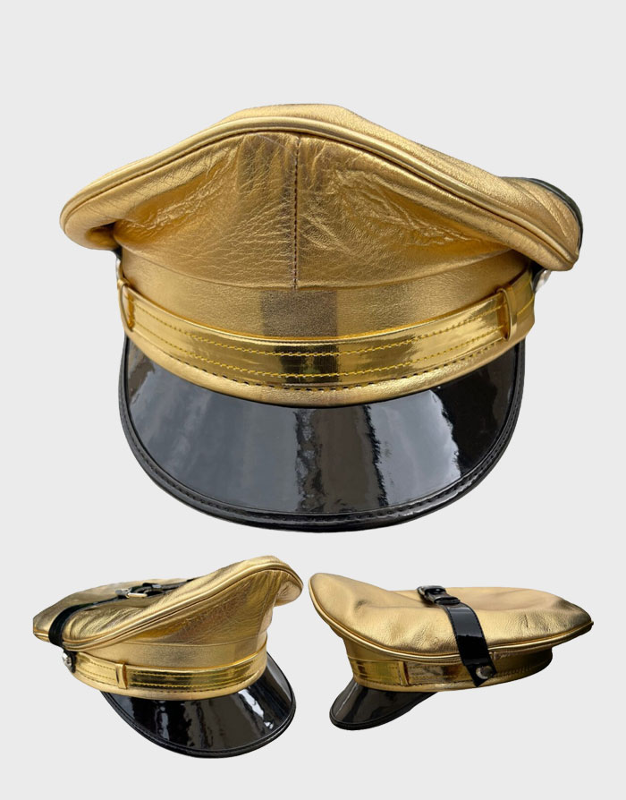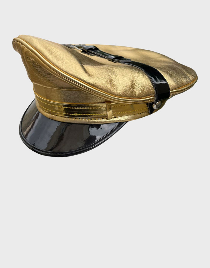 Real Cowhide Leather Golden Print Cap. Excellent quality, soft Real Cowhide leather Golden print biker,muir,Gay,military, police hat with all important bits in place. > Hard, shiny peak and Leather strap with silver buckle.