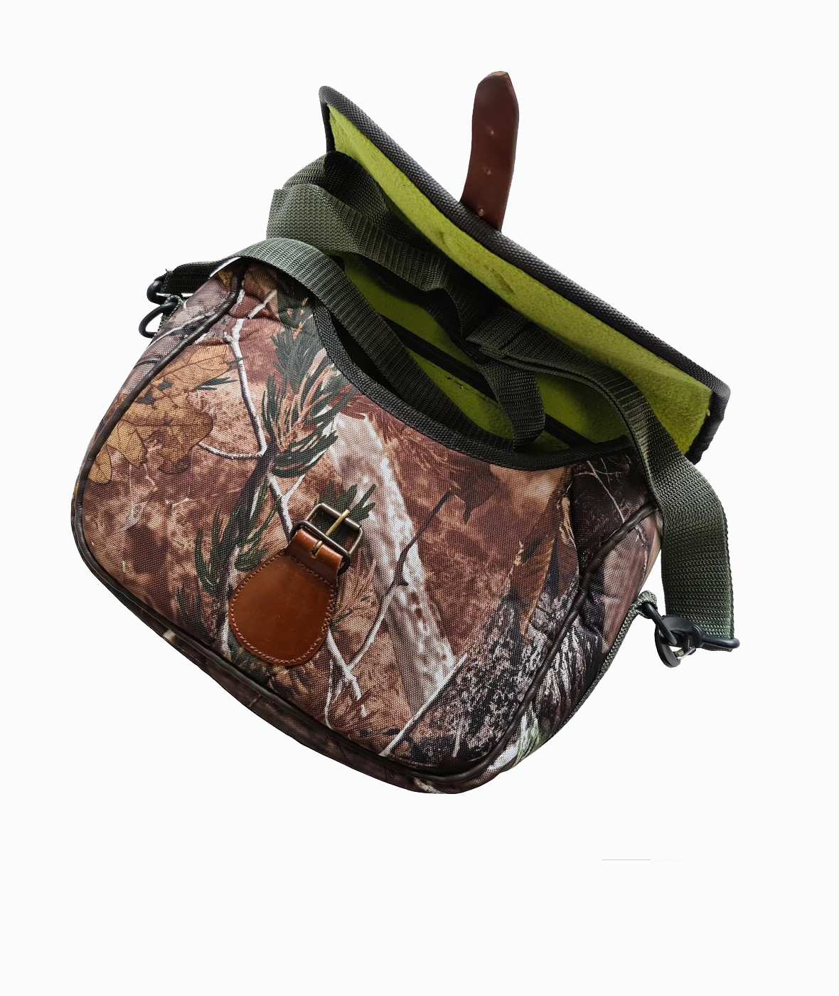 Camo print exterior and lime green interior.