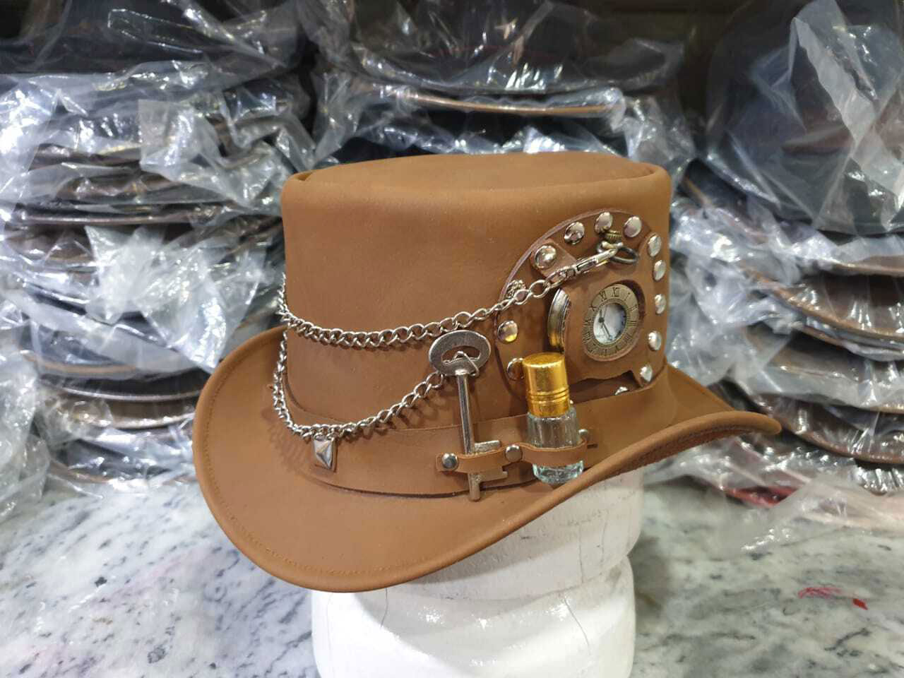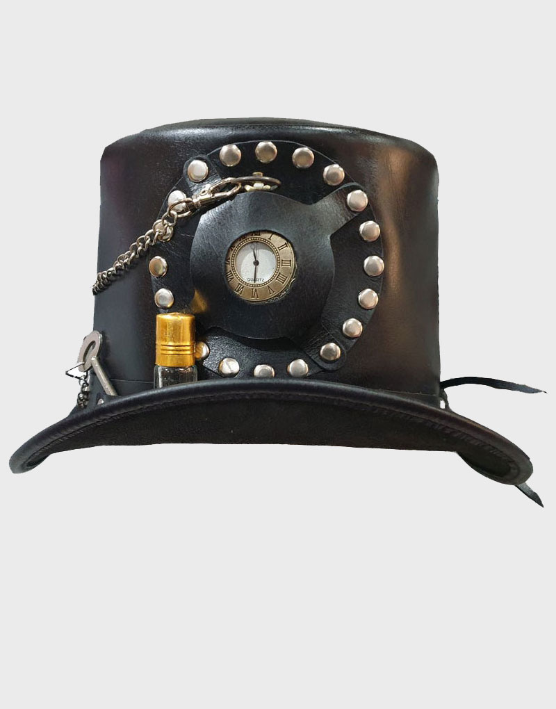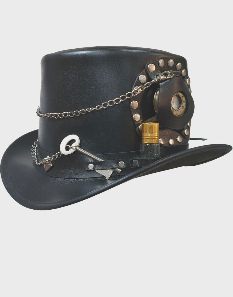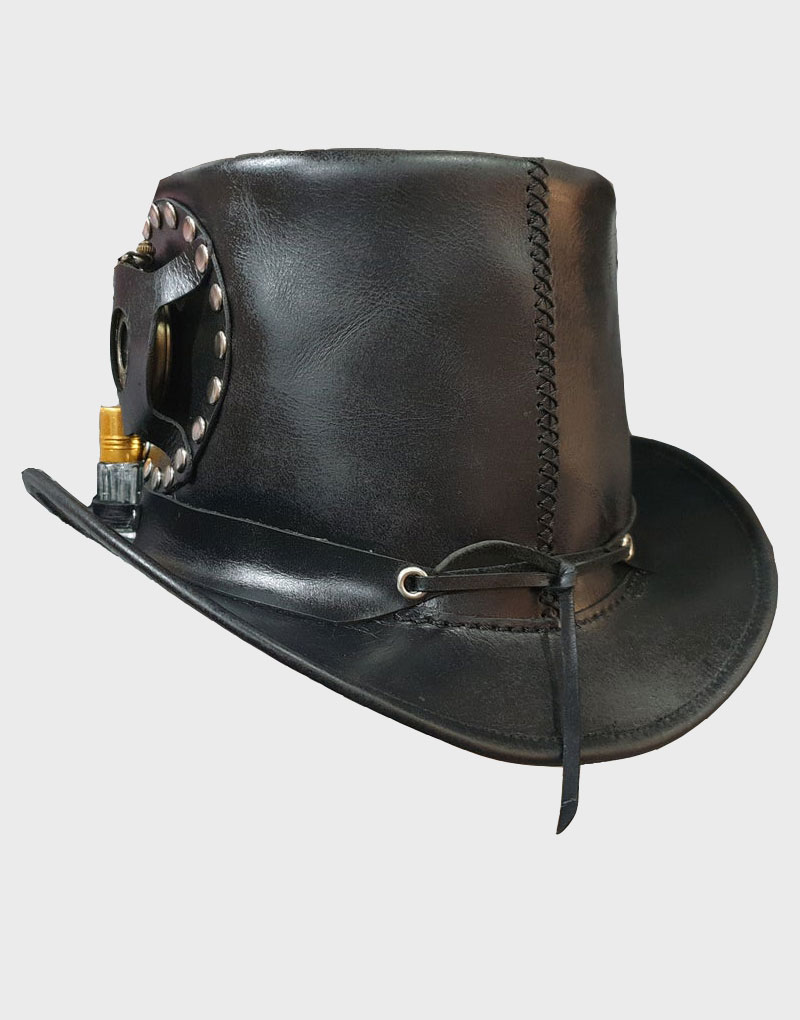 Steampunk Time Port Leather Top Hat, Premium Quality Cow Grain Leather. Time Port is fully equipped for any and all situations the discerning, yet adventurous time traveler may face.